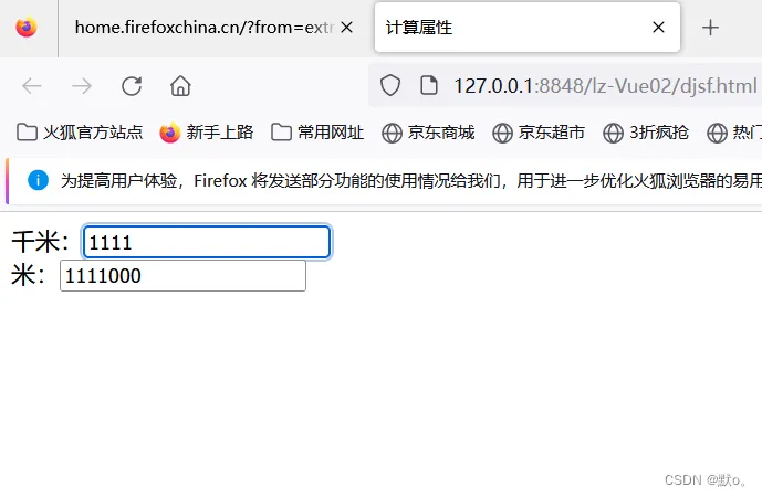 <!DOCTYPE html> <html> <head> <meta charset="utf-8"> <script src="https://cdn.bootcdn.net/ajax/libs/jquery/3.7.1/jquery.js"></script> <!-- 1.导入vue在线依赖--> <script src="https://cdn.bootcdn.net/ajax/libs/vue/2.6.10/vue.js"></script> <script src="js/date.js"></script> <title>计算属性</title> <!-- 2.定义vue所管理的边界(有且只有一个根节点) --> <script src="date.js" type="text/javascript" charset="utf-8"></script> <body> <!-- 定义边界 --> <div id="app"> 千米:<input v-model="km"><br> 米:<input v-model="m"> </div> <script type="text/javascript"> new Vue({ el: '#app', data(){ return{ m:1000, km:1 } }, watch:{ // v指的是m变量 m: function(v){ this.km = parseInt(v)/1000; }, // v指的是km变量 km: function(v){ this.m = parseInt(v)*1000; } } }) </script> </head> <body> </body> </html>