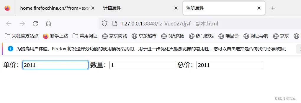 <!DOCTYPE html> <html> <head> <meta charset="utf-8"> <script src="https://cdn.bootcdn.net/ajax/libs/jquery/3.7.1/jquery.js"></script> <!-- 1.导入vue在线依赖--> <script src="https://cdn.bootcdn.net/ajax/libs/vue/2.6.10/vue.js"></script> <script src="js/date.js"></script> <title>监听属性</title> <!-- 2.定义vue所管理的边界(有且只有一个根节点) --> <script src="date.js" type="text/javascript" charset="utf-8"></script> <body> <!-- 定义边界 --> <div id="app"> 单价:<input v-model="price"> 数量:<input v-model="num"> 总价:<input v-model="count"> </div> <script type="text/javascript"> new Vue({ el: '#app', data(){ return{ price:20, num:1 } }, computed:{ count:function(){ return this.price*this.num } } }) </script> </head> <body> </body> </html>