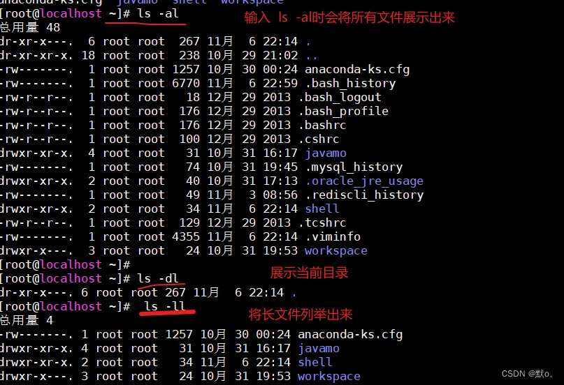 - ls(英文全拼:list files): 列出目录及文件名