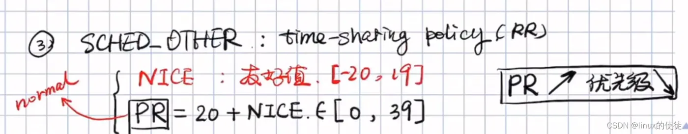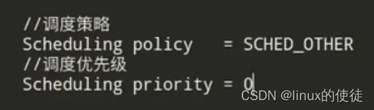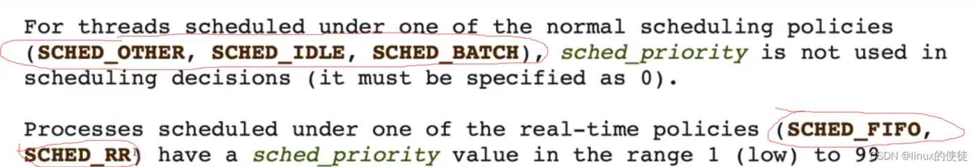 - Normal Scheduling(正常调度):总共有三种,分别为SCHED_OTHER,SCHED_IDLE,SCHED_BATCH, 它的优先级数值priority_value需要设置成0,但这里并不一定意味着这个进程优先级很高,因为这个0是默认值。