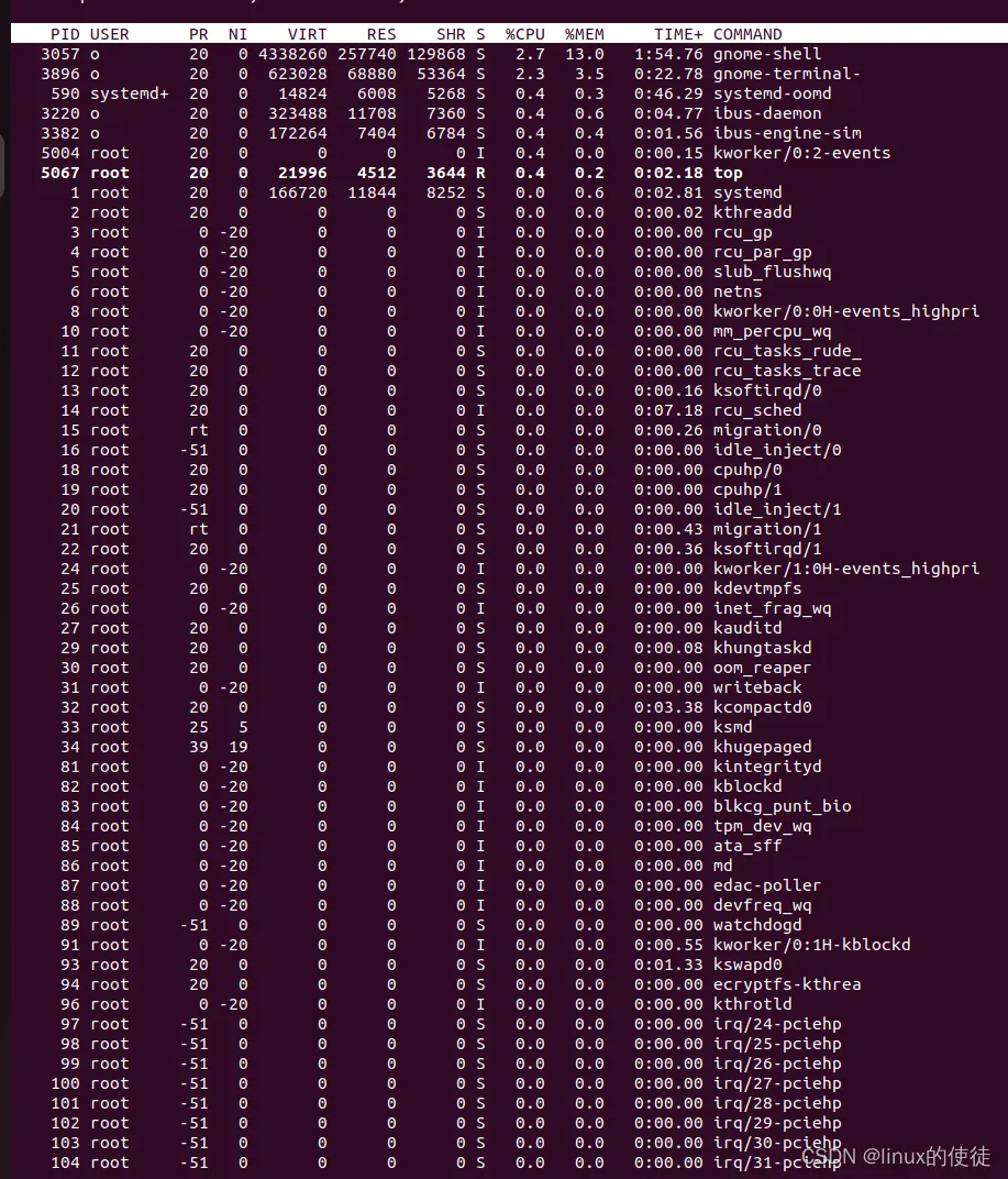PR值为rt(实时进程)、负数(实时进程)、0(优先级极高),默认值20。