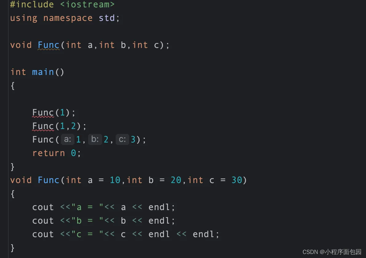 void Func(int a, int b = 20, int c = 30) { cout <<"a = "<< a << endl; cout <<"b = "<< b << endl; cout <<"c = "<< c << endl << endl; }