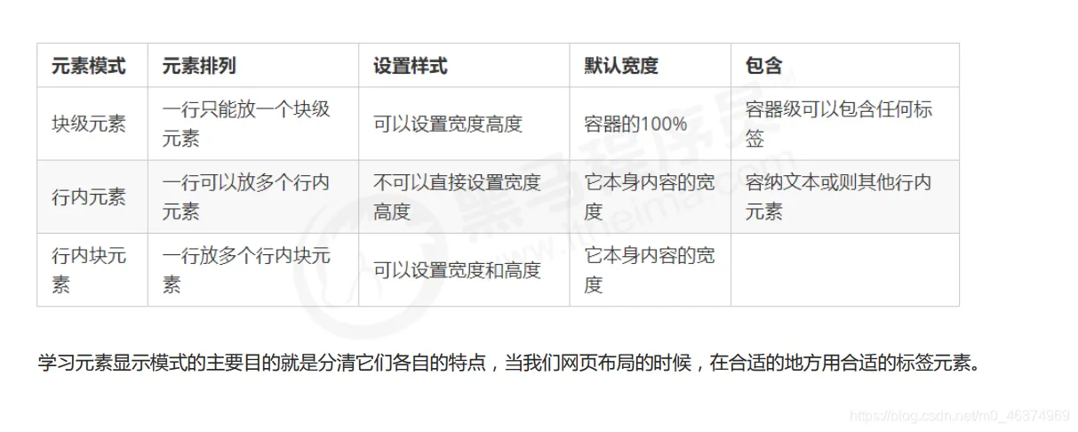 **块元素:**常见的块元素有<h1>~<h6>、<p>、<div>、<ul>、<ol>、<li>