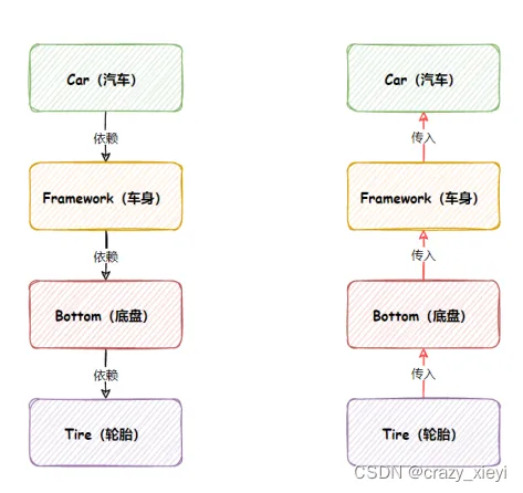 我们将控制权反转,此时,我们只需要将原来由⾃⼰创建的下级类,改为传递的⽅式(也就是注⼊的⽅式),因为我们不需要在当前类中创建下级类了,所以下级类即使发⽣变化(创建或减少参数),当前类本身也⽆需修改任何代码,这样就完成了程序的解耦。
