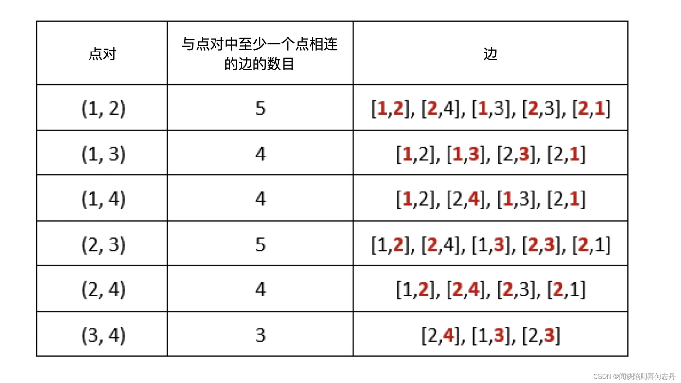 解释:每个点对中,与至少一个点相连的边的数目如上图所示。