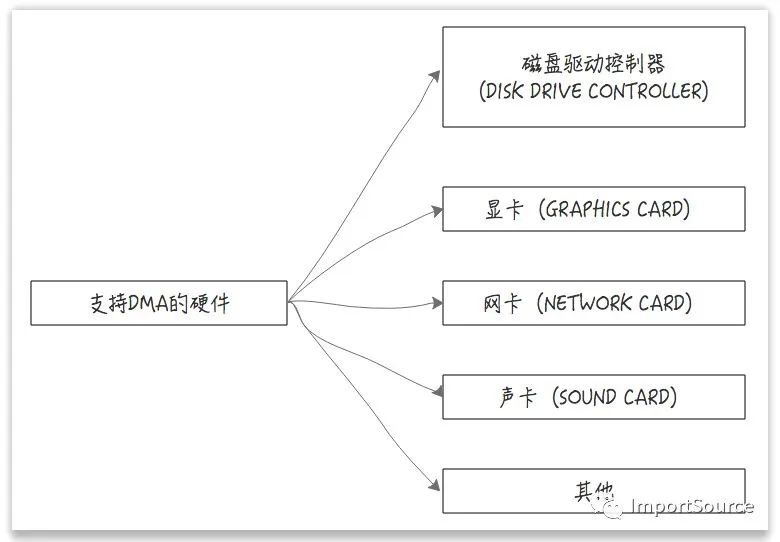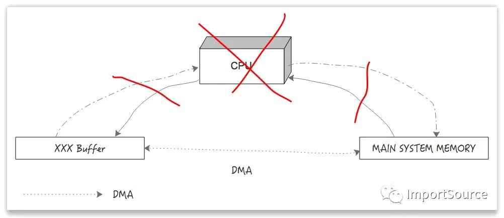 而DMA,则可以绕过CPU,硬件自己去直接访问系统主内存。如下图: