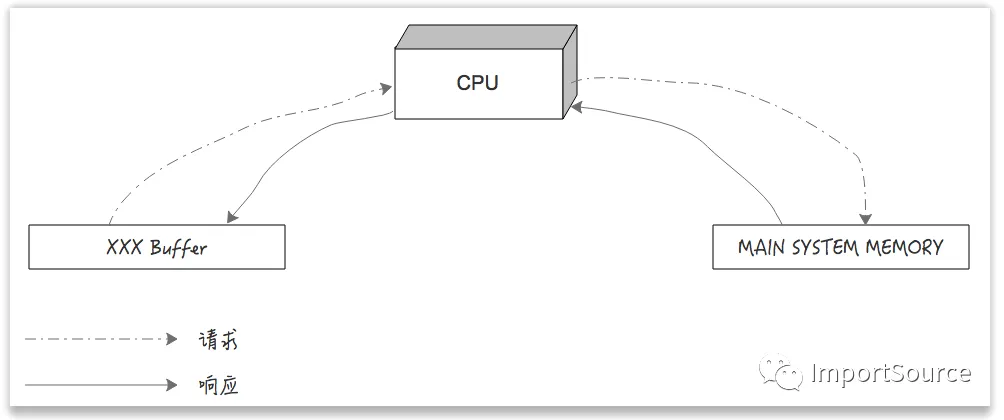 DMA,全称叫Direct Memory Access,一种可让某些硬件子系统去直接访问系统主内存,而不用依赖CPU的计算机系统的功能。听着是不是很厉害,跳过CPU,直接访问主内存。传统的内存访问都需要通过CPU的调度来完成。如下图: