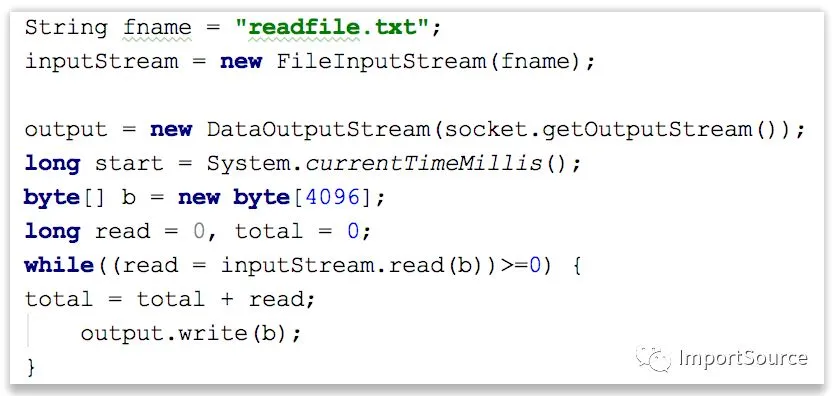 传统的文件传输是通过java.io.DataOutputStream,java.io.FileInputStream来实现的,然后通过while循环来读取input,然后写入到output中。