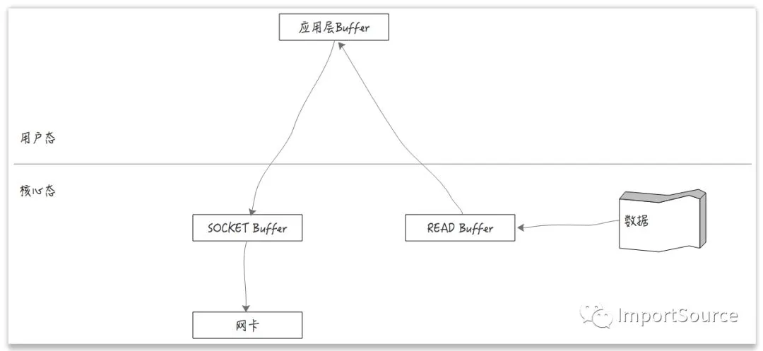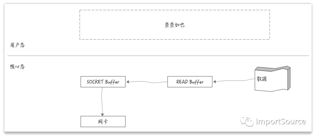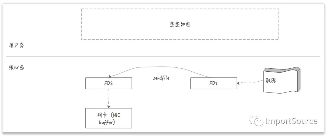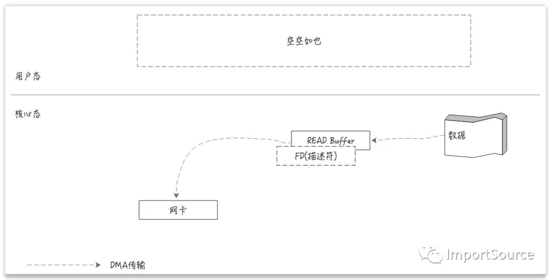 此时我们会发现用户态“空空如也”。数据没有来到用户态,而是直接在核心态就进行了传输,但这样依然还是有多次复制。首先数据被读取到read buffer中,然后发到socket buffer,最后才发到网卡。虽然减少了用户态和核心态的切换,但依然存在多次数据复制。