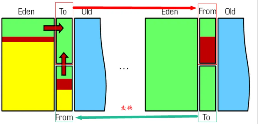 新生代共有两个 Survivor 区,我们分别用 from 和 to 来指代。其中 to 指向的 Survivior 区是空的。当发生 Minor GC 时,Eden 区和 from 指向的 Survivor 区中的存活对象会被复制到 to 指向的 Survivor 区中,然后交换 from 和 to 指针,以保证下一次 Minor GC 时,to 指向的 Survivor 区还是空的。