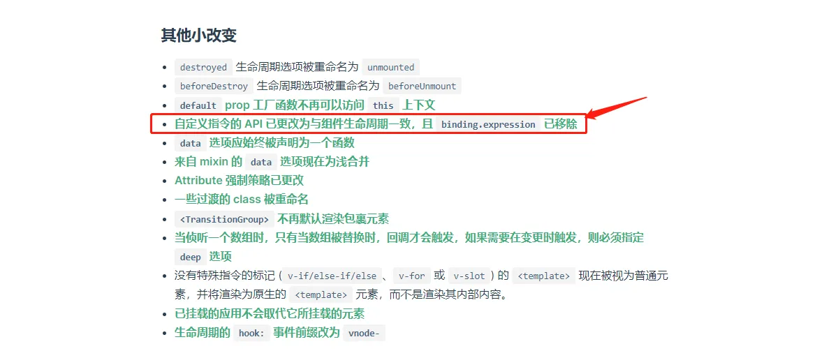 根据vue3文档的描述 https://v3.cn.vuejs.org/guide/migration/introduction.html#%E6%B8%B2%E6%9F%93%E5%87%BD%E6%95%B0 自定义指令的 API 已更改为与组件生命周期一致。 且 binding.expression 已移除。 也就是说vue2的自定义钩子函数被移除了。 我们不能够在使用vue2的自定钩子函数了