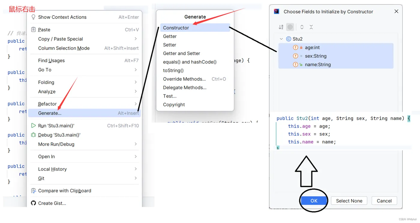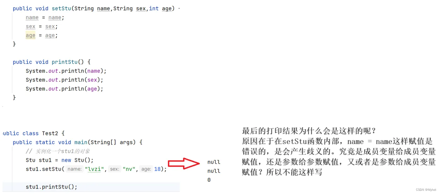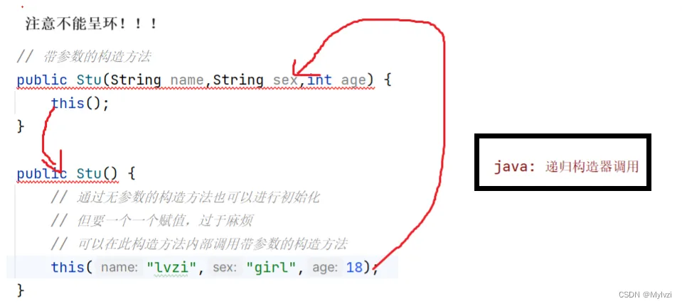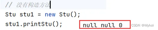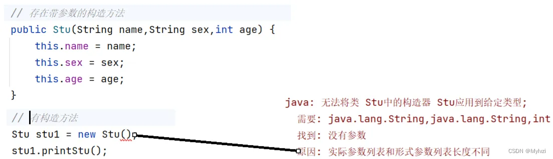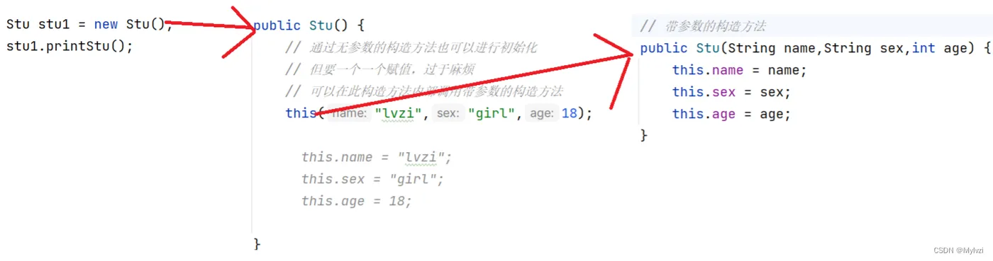 // 带参数的构造方法 public Stu(String name,String sex,int age) { this.name = name; this.sex= sex; this.age = age; } // 利用带参数构造方法,只需在创建对象时传入参数即可 // 编译器会进入到构造方法,帮助你初始化成员对象 Stu stu1 = new Stu("绿子","女",18); stu1.printStu();