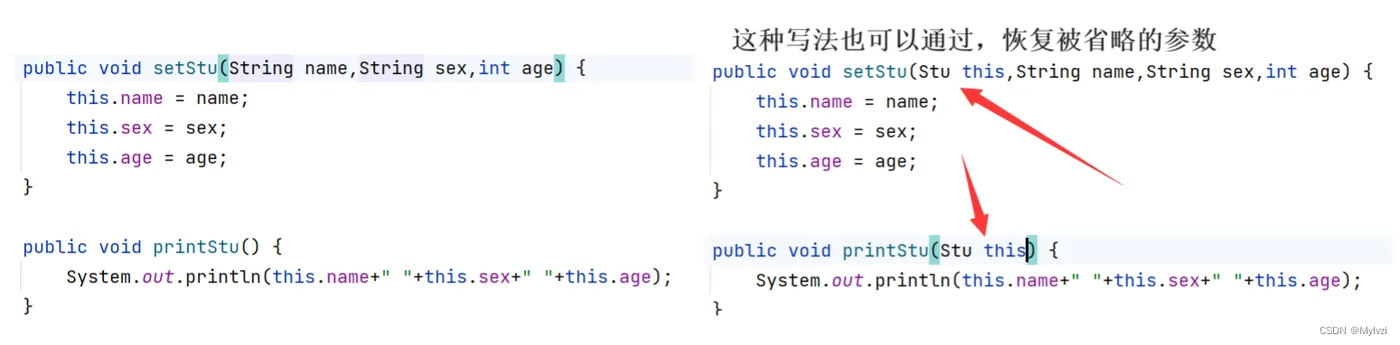 // 创建一个学生类 class Stu{ public String name; public String sex; public int age; // 所有对成员变量进行操作的地方都要添加this,代表是当前对象调用的方法!!! // this写在方法内部 public void setStu(String name,String sex,int age) { this.name = name; this.sex = sex; this.age = age; } public void printStu() { System.out.println(this.name+" "+this.sex+" "+this.age); } } public class Test2 { public static void main(String[] args) { // 实例化一个stu1的对象 Stu stu1 = new Stu(); Stu stu2 = new Stu(); Stu stu3 = new Stu(); stu1.setStu("lvzi","nv",18); stu2.setStu("biandu","nan",19); stu3.setStu("栀子","nv",20); stu1.printStu(); stu2.printStu(); stu3.printStu(); } }