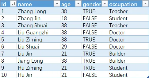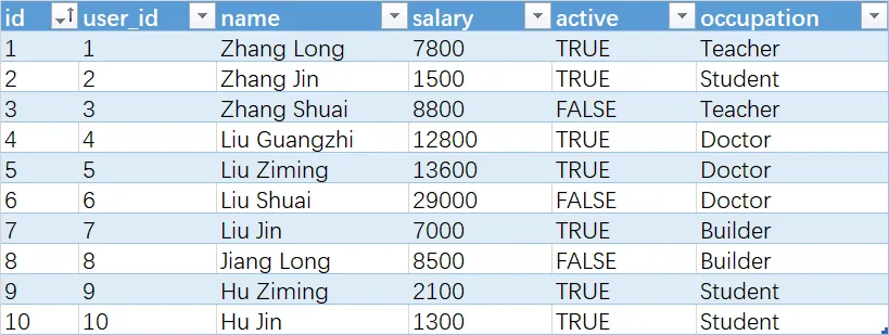 /* SQL里的表达: 查询所有用户的姓名、年龄、职业、性别、是否在职和薪资*/SELECTu.id, u.name, u.age, u.occupation, u.gender, s.active, s.salaryFROMUserASuLEFTJOINSalaryASsONu.id=s.user_id;