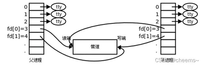 一个进程在由pipe()创建管道后,一般再fork一个子进程,然后通过管道实现父子进程间的通信。父子进程间具有相同的文件描述符,且指向同一个管道pipe,其他没有关系的进程不能获得pipe()产生的两个文件描述符,也就不能利用同一个管道进行通信。