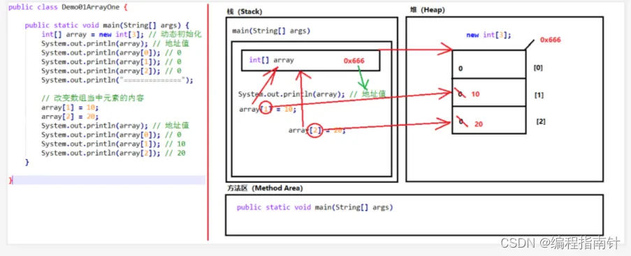 public class ArrayDemo { public static void main(String[] args) { int[] arr = new int[3]; //输出数组名 System.out.println(arr); //[I@880ec60 //输出数组中的元素 System.out.println(arr[0]); System.out.println(arr[1]); System.out.println(arr[2]); } }