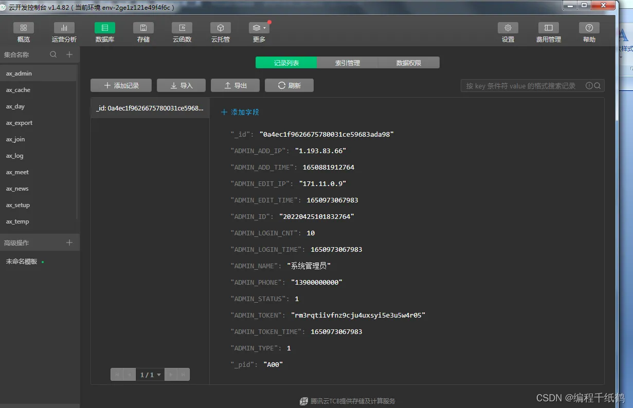 本健康小程序管理系统的开发基于微信云开发实现,使用了微信云服务器的数据库服务来进行数据存储,它使用的是Mongodb数据库。点击微信开发者工具上面的云开发,可以进入自己申请的云服务列表,选择数据库,可以查看相关的数据库表结构及数据: