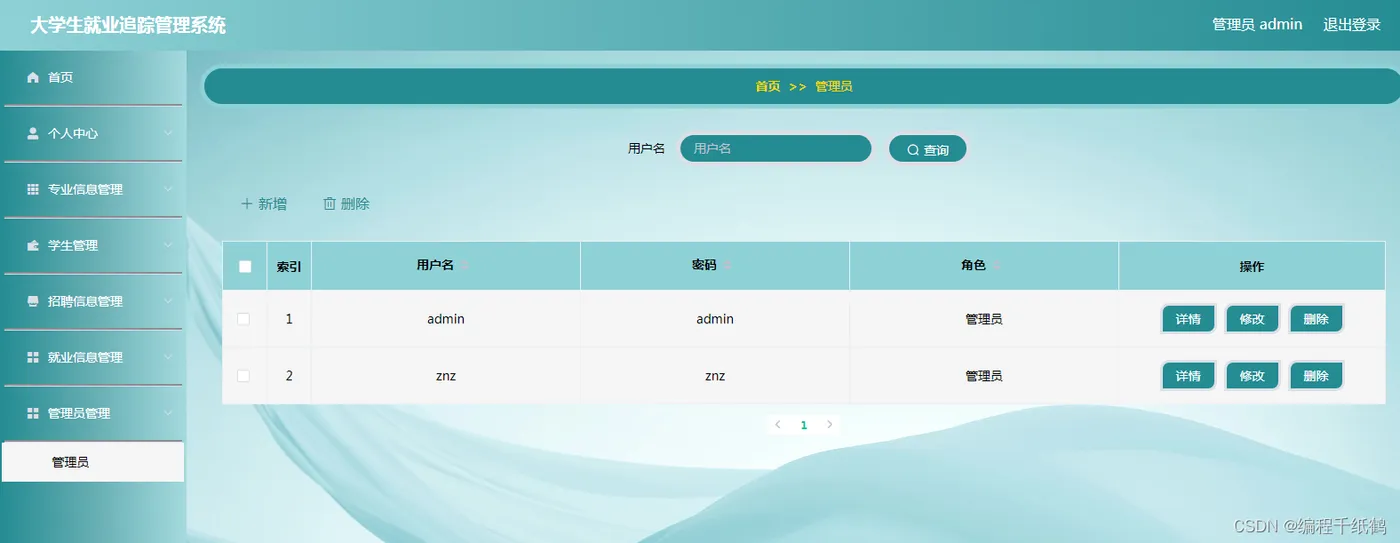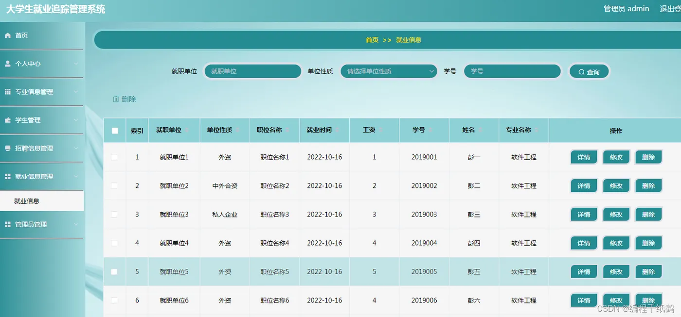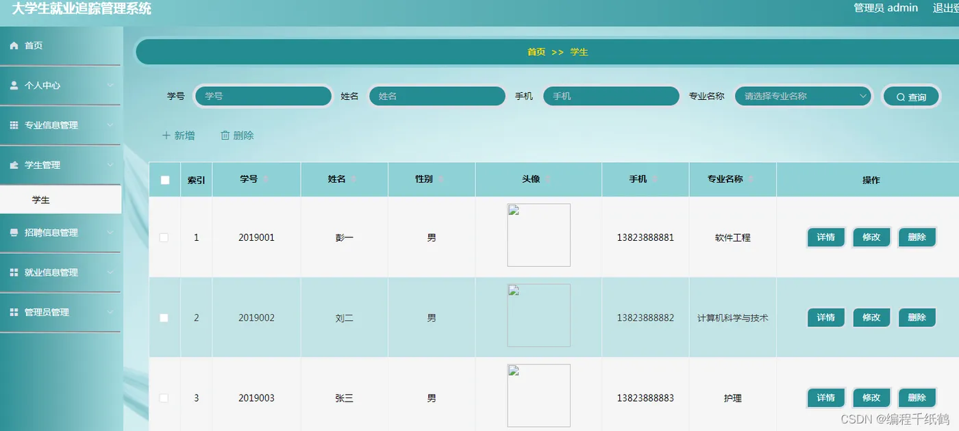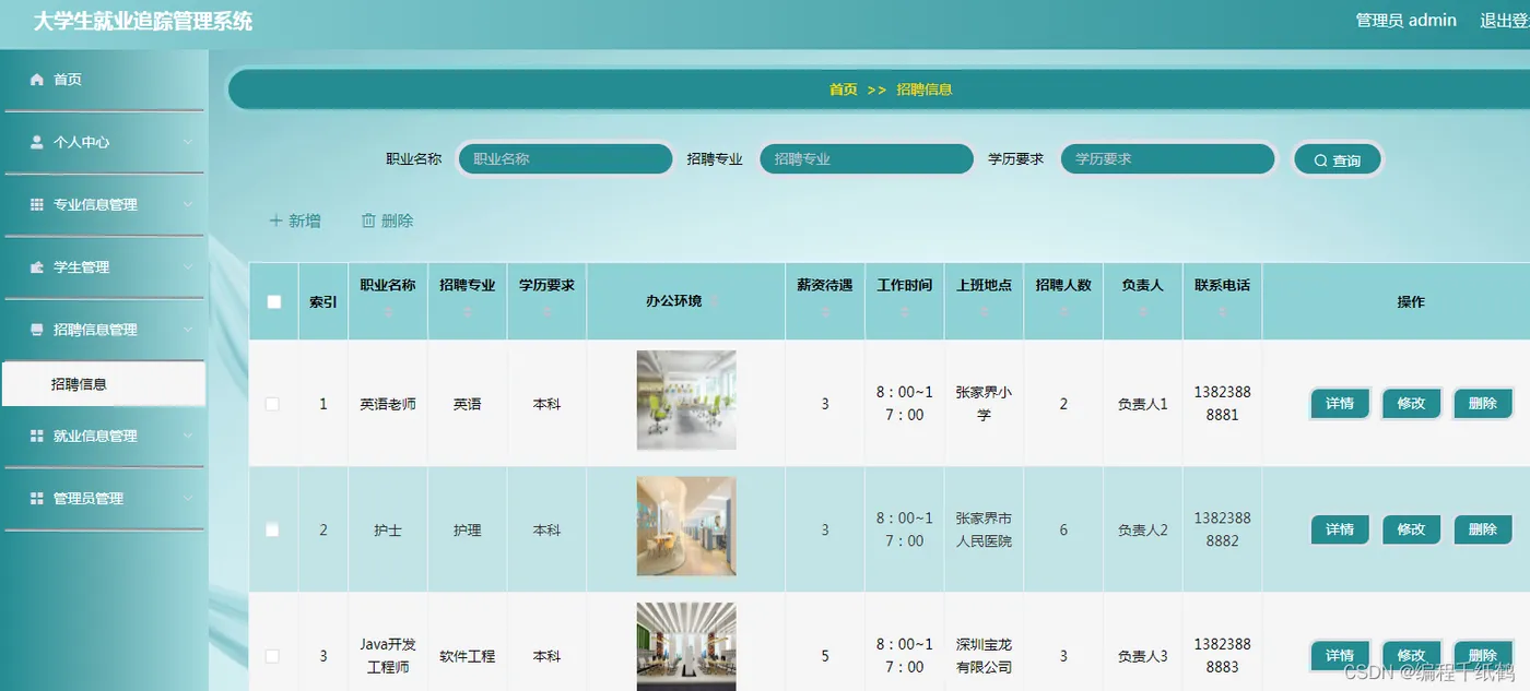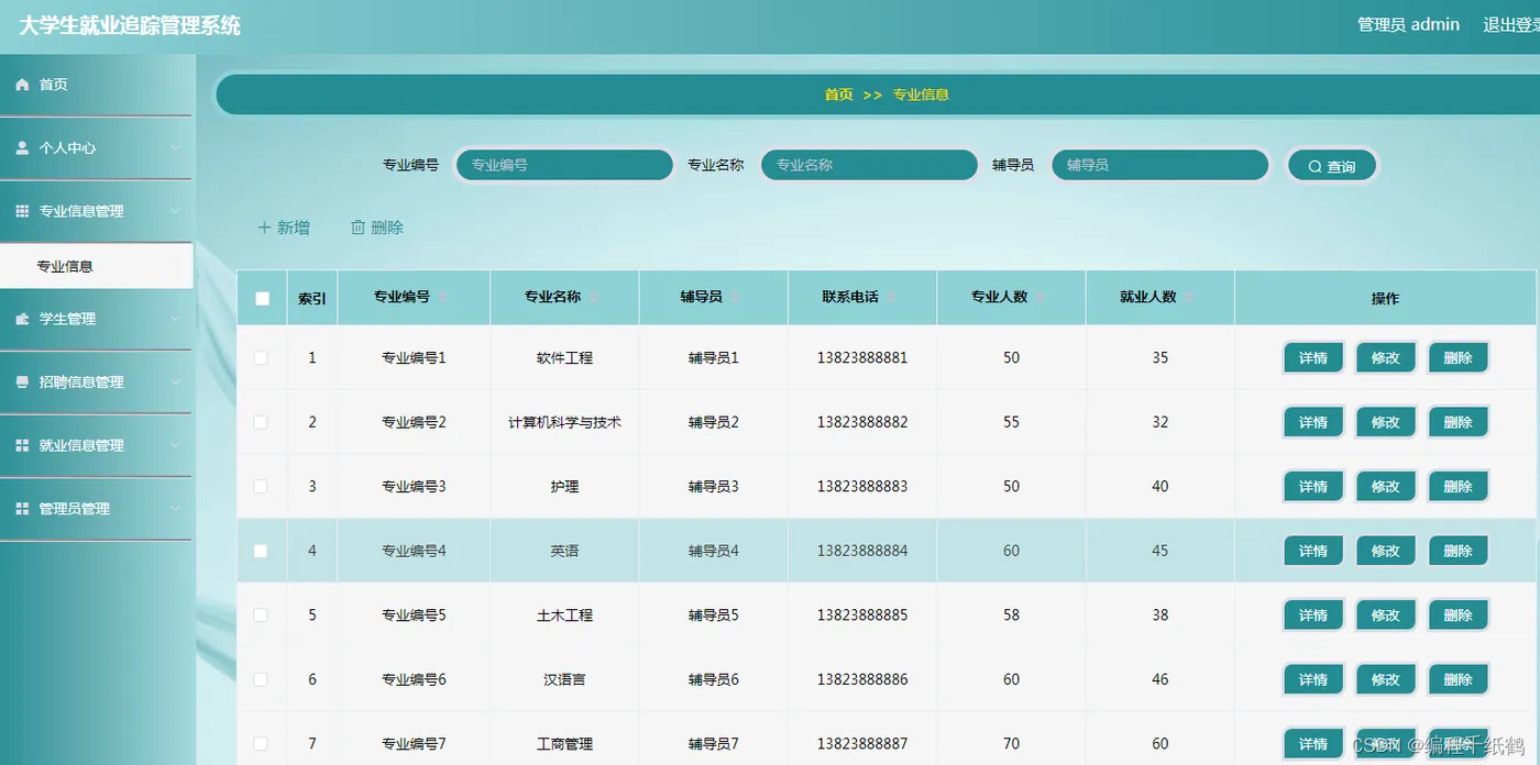 管理员管理模块:管理员登录成功后,可在个人中心修改自己的密码和用户名,在专业信息管理管理员将所有毕业学生的专业、辅导员、专业人数和就业人数等信息汇总进行添加,修改,查询,删除。在学生管理中管理员通过对学生学号、姓名、性别、专业名称、毕业走向(考研、考公、参军、出国留学、灵活就业、创业)等信息进行汇总,然后健出表格,对其进行学生信息的添加、修改、查询、产出。在招聘信息管理中管理员通过对校招企业的工作岗位需求的要求、薪资待遇、工作时间、招聘人数以及负责人的基本信息进行汇总,之后可对其进行信息添加、修改、查询、删除。在就业信息管理中管理员将毕业就业生就业信息进行汇总(就职单位,单位性质,职位名称,就业时间,工资,学号,姓名,专业名称)对其进行管理。管理员可以管理多个管理员账号。