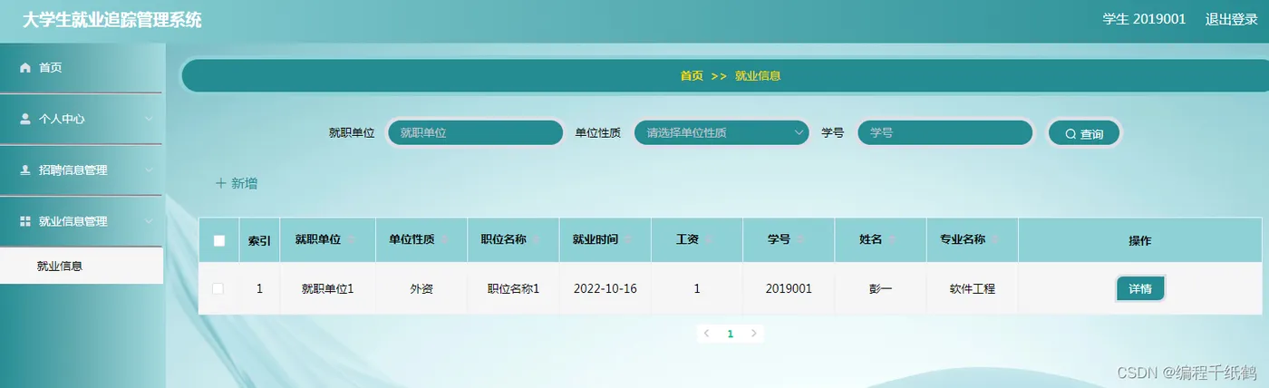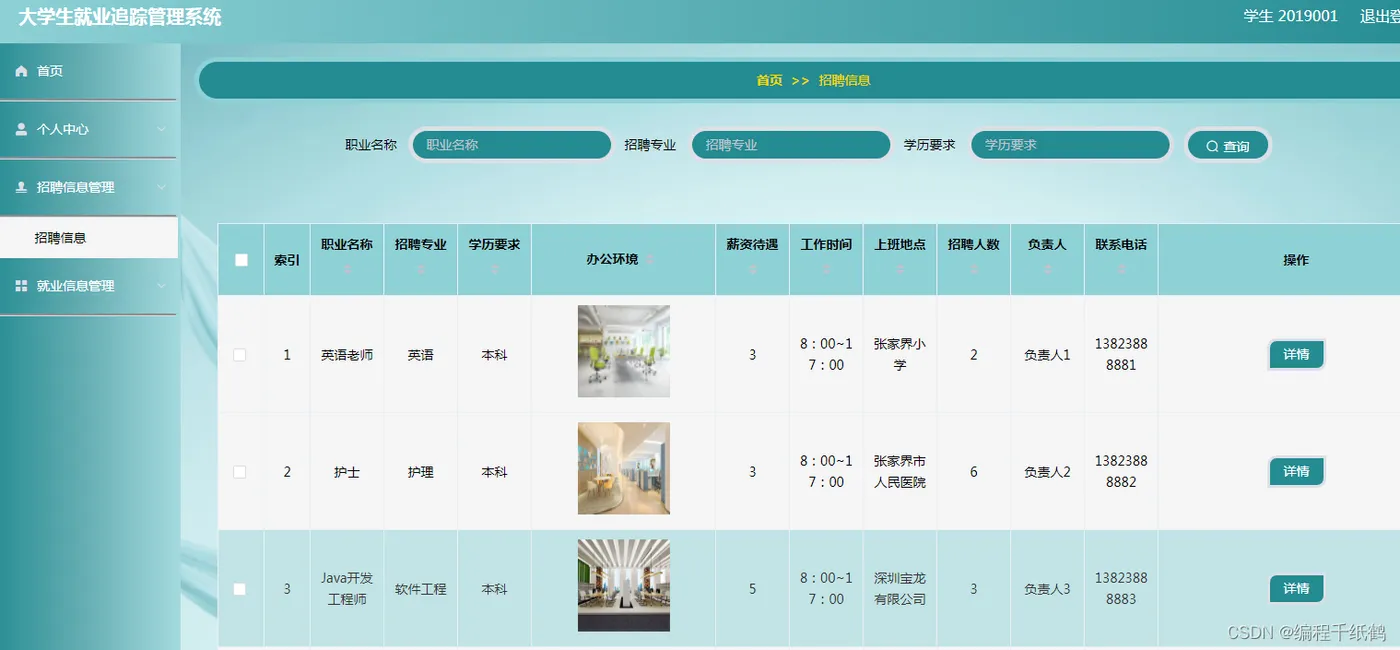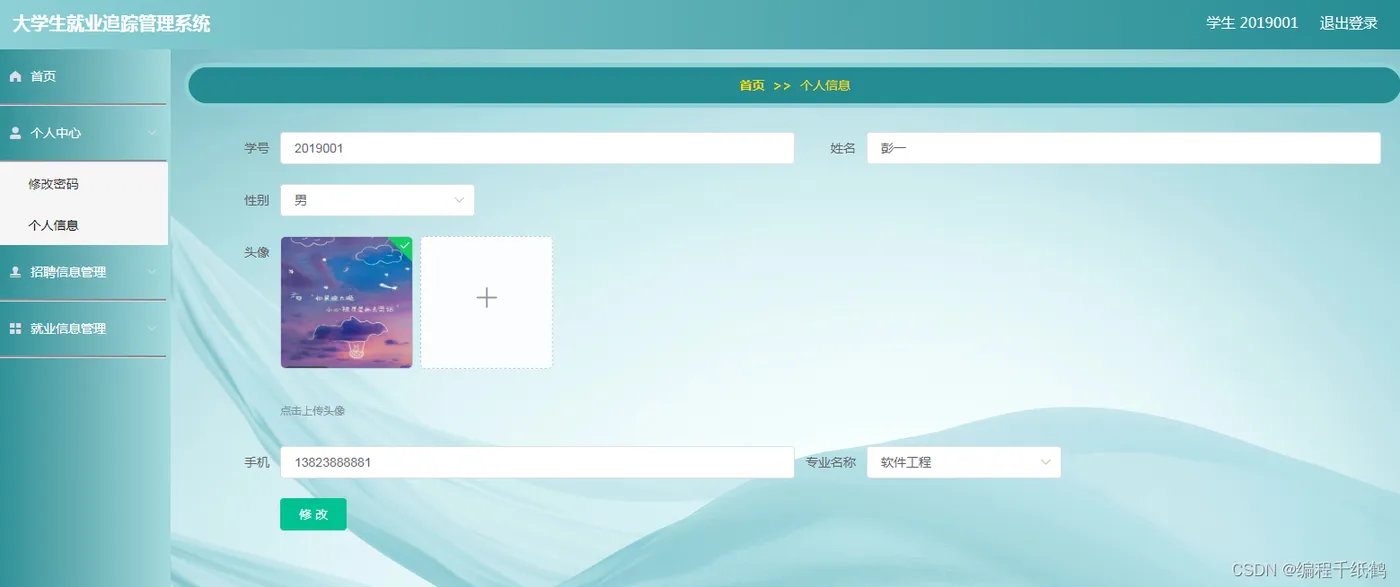 学生应用管理模块:学生登录成功后,可在个人中心修改密码以及对个人信息姓名、性别、头像、手机号和专业名称的修改。在招聘信息中可以查询学生所喜欢的企业,职位等等以及了解该企业的基本信息。在就业信息中学生可以编写出自己所在的工作企业及其基本信息(单位性质,职位名称,工资)以及个人的学校信息(学号、姓名、专业名称)。