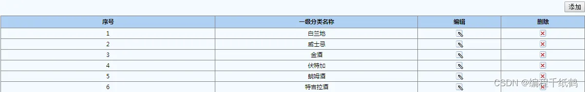 这个模块的功能是管理首页上的导航模块上的一级分类部分,可添加新分类,具有编辑,删除,添加三个操作按钮。如图5-12所示: