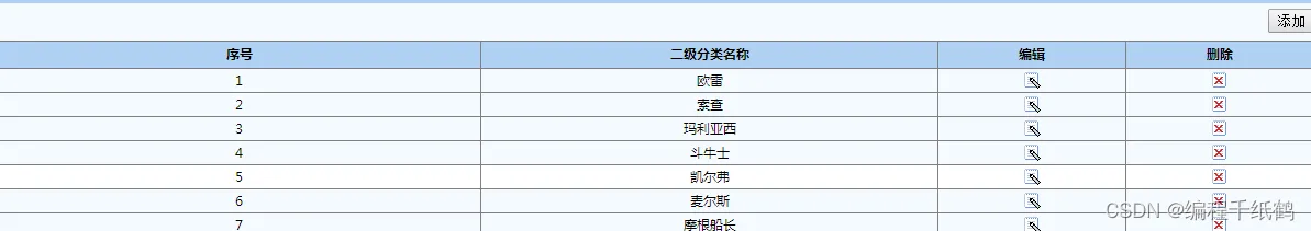 这个模块的功能是管理点导航模块上的一级分类部分时出现的二级分类部分,二级分类是依据一级分类为前提的。可添加新分类,具有编辑,删除,添加三个操作按钮。如图5-13所示: