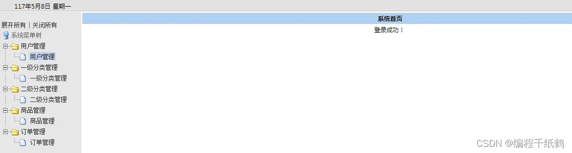 系统后台管理分类为以下模块:注册用户管理,一级分类管理,二级分类管理,商品管理,订单管理。