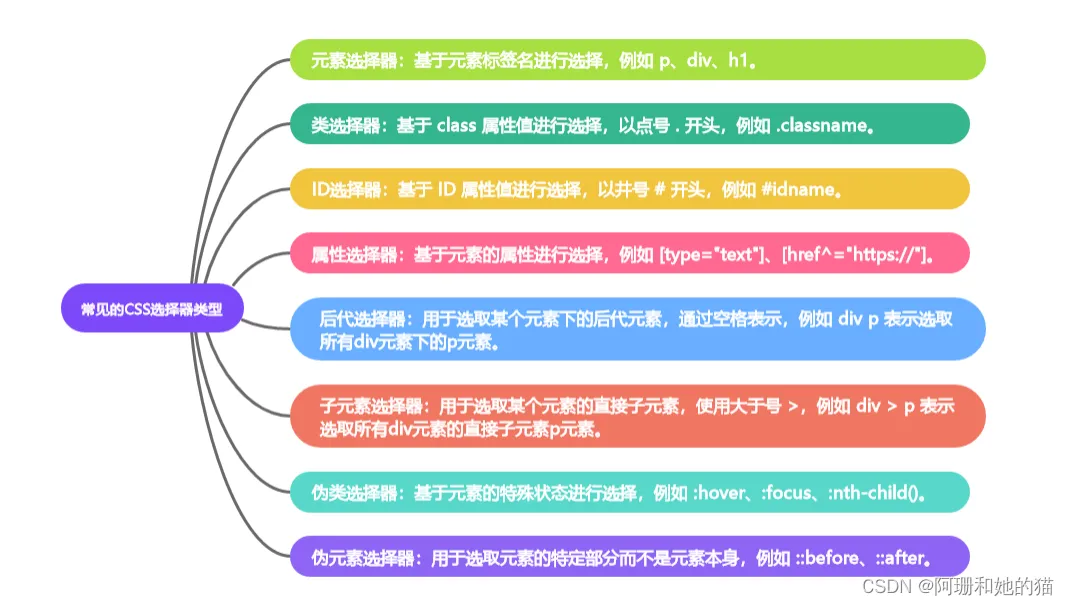 #开头,例如#idname。 - 属性选择器:基于元素的属性进行选择,例如