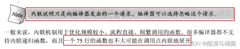 优势:少了调用开销,提高程序运行效率 - inline对于编译器而言只是一个建议,不同编译器关于inline实现机制可能不同,一般建议:将函数规模较小(即函数不是很长,具体没有准确的说法,取决于编译器内部实现)、不是递归、且频繁调用的函数采用inline修饰,否则编译器会忽略inline特性。下图为 《C++prime》第五版关于inline的建议: