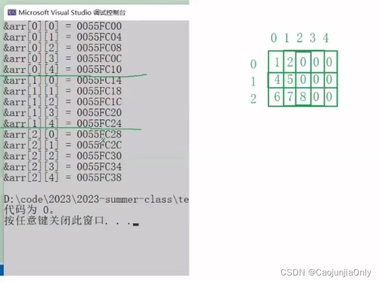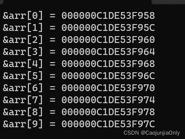 仔细观察输出的结果,我们知道,随着数组下标的增长,元素的地址,也在有规律的递增。