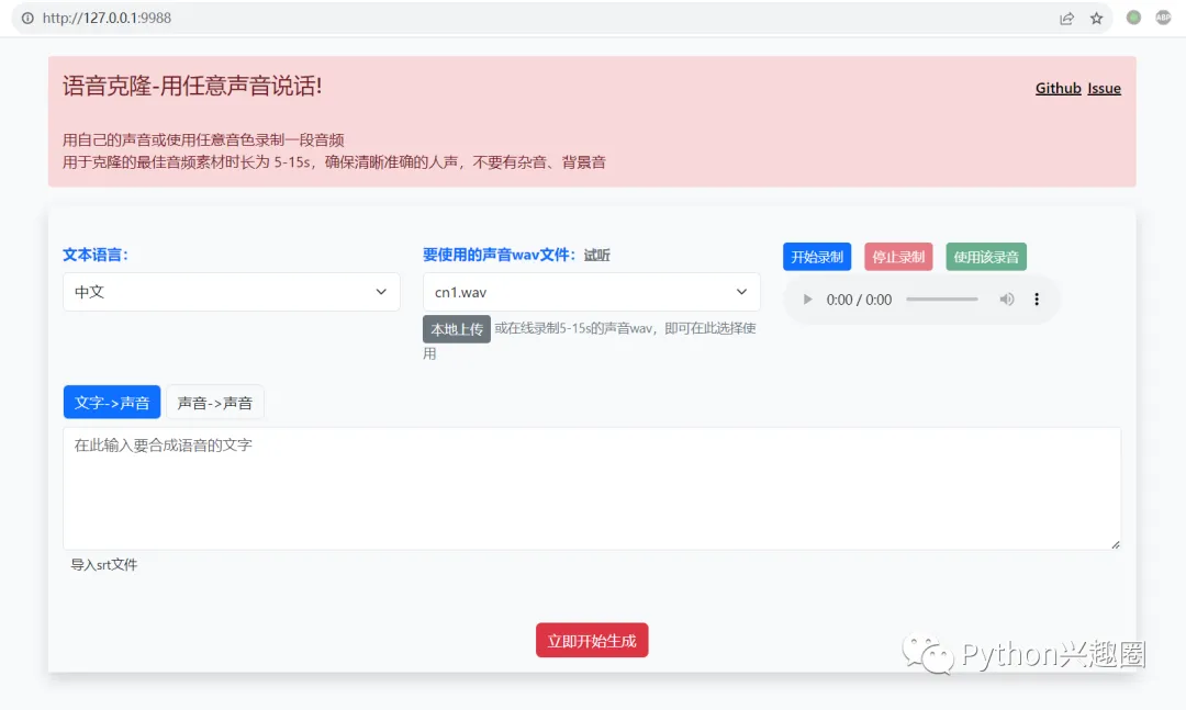 一个带web界面的声音克隆工具,使用你的音色或任意声音来录制音频。提取人类音色,将文字或其他语音转成该音色 。