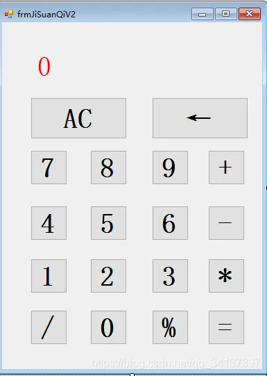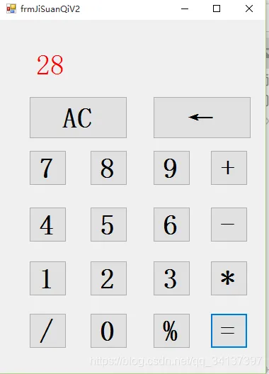 //等于的按钮 private void btndeng_Click(object sender, EventArgs e) { //string xianshi = sb.ToString(); switch (fu) { case "+": this.lbljieguo.Text = (int.Parse(num1.ToString()) + int.Parse(num2.ToString())).ToString(); break; case "-": this.lbljieguo.Text = (int.Parse(num1.ToString()) - int.Parse(num2.ToString())).ToString(); break; case "*": this.lbljieguo.Text = (int.Parse(num1.ToString()) * int.Parse(num2.ToString())).ToString(); break; case "/": this.lbljieguo.Text = (int.Parse(num1.ToString()) / int.Parse(num2.ToString())).ToString(); break; case "%": this.lbljieguo.Text = (int.Parse(num1.ToString()) % int.Parse(num2.ToString())).ToString(); break; } num1 = new StringBuilder(""); num2 = new StringBuilder(""); sb = new StringBuilder(""); flag = false; ji = true; //显示的是结果 }