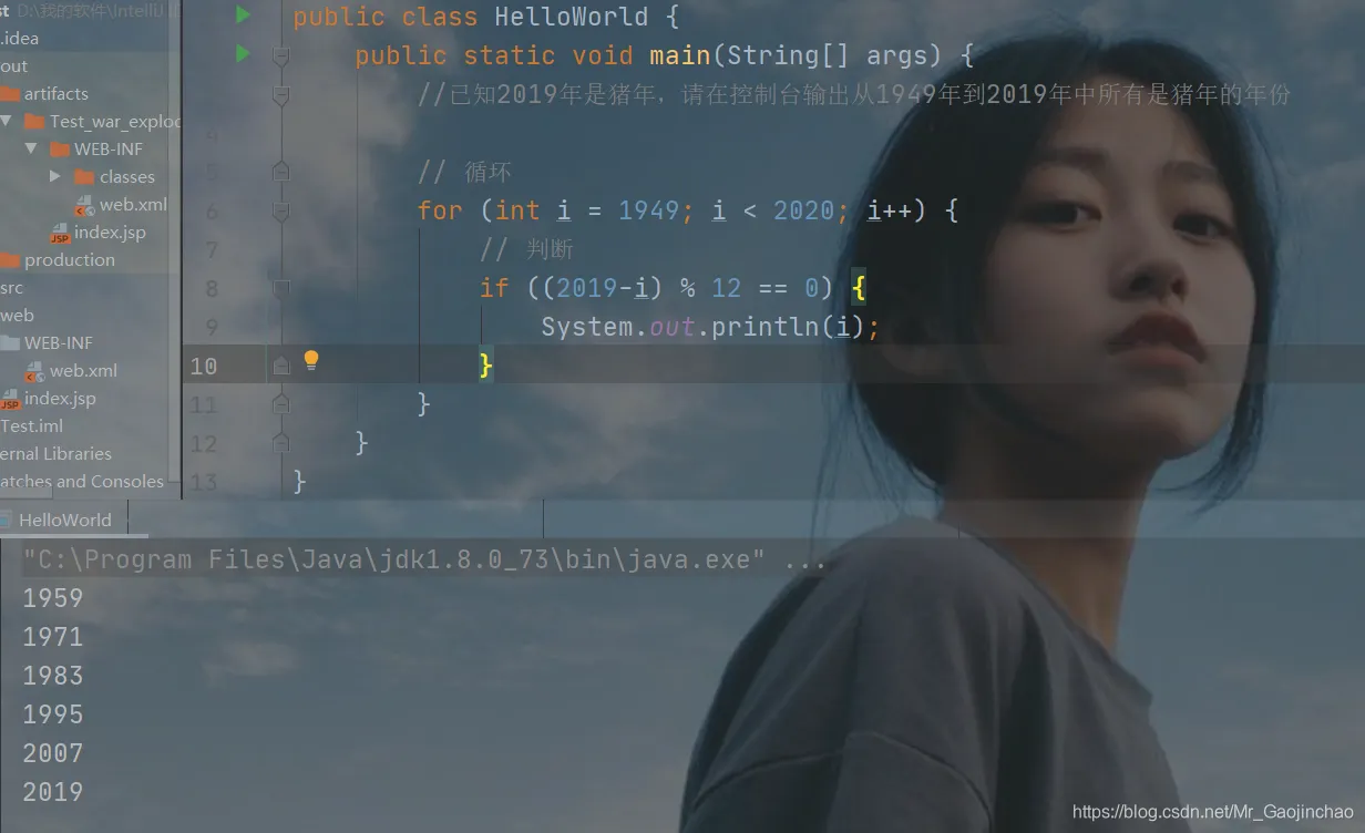 public class HelloWorld { public static void main(String[] args) { //已知2019年是猪年,请在控制台输出从1949年到2019年中所有是猪年的年份 // 循环 for (int i = 1949; i < 2020; i++) { // 判断 if ((2019-i) % 12 == 0) { System.out.println(i); } } } }