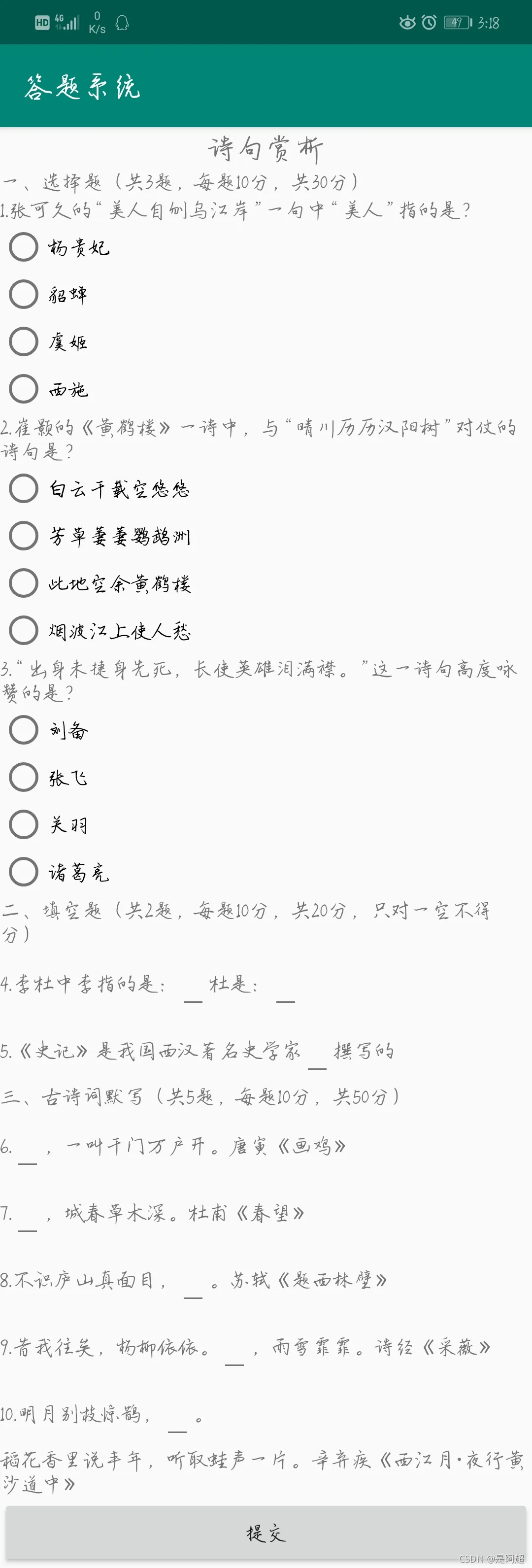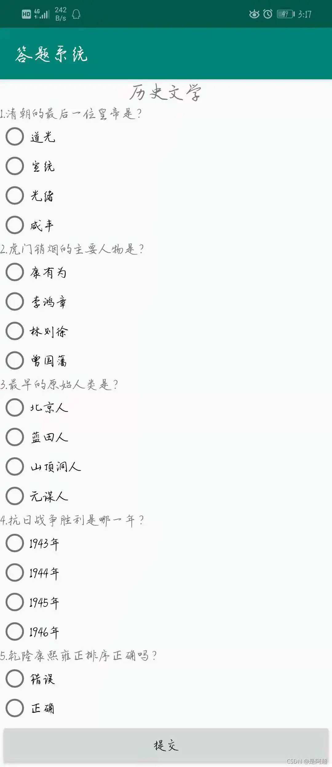 <?xml version="1.0" encoding="utf-8"?> <ScrollView xmlns:android="http://schemas.android.com/apk/res/android" xmlns:app="http://schemas.android.com/apk/res-auto" xmlns:tools="http://schemas.android.com/tools" android:layout_width="match_parent" android:layout_height="match_parent" android:scrollbars="none" tools:context="top.gaojc.answerSystem.questionBank.HistoryActivity"> <LinearLayout android:layout_width="match_parent" android:layout_height="wrap_content" android:orientation="vertical"> <TextView android:layout_width="match_parent" android:layout_height="wrap_content" android:text="历史文学" android:gravity="center" android:textSize="20sp"/> <TextView android:layout_width="wrap_content" android:layout_height="wrap_content" android:text="1.清朝的最后一位皇帝是?" /> <RadioGroup android:layout_width="match_parent" android:layout_height="wrap_content" android:orientation="vertical"> <RadioButton android:layout_width="wrap_content" android:layout_height="wrap_content" android:text="道光" /> <RadioButton android:id="@+id/xuantong" android:layout_width="wrap_content" android:layout_height="wrap_content" android:text="宣统" /> <RadioButton android:layout_width="wrap_content" android:layout_height="wrap_content" android:text="光绪" /> <RadioButton android:layout_width="wrap_content" android:layout_height="wrap_content" android:text="咸丰" /> </RadioGroup> <TextView android:layout_width="wrap_content" android:layout_height="wrap_content" android:text="2.虎门销烟的主要人物是?" /> <RadioGroup android:layout_width="match_parent" android:layout_height="wrap_content" android:orientation="vertical"> <RadioButton android:layout_width="wrap_content" android:layout_height="wrap_content" android:text="康有为" /> <RadioButton android:layout_width="wrap_content" android:layout_height="wrap_content" android:text="李鸿章" /> <RadioButton android:id="@+id/linzexu" android:layout_width="wrap_content" android:layout_height="wrap_content" android:text="林则徐" /> <RadioButton android:layout_width="wrap_content" android:layout_height="wrap_content" android:text="曾国藩" /> </RadioGroup> <TextView android:layout_width="wrap_content" android:layout_height="wrap_content" android:text="3.最早的原始人类是?" /> <RadioGroup android:layout_width="match_parent" android:layout_height="wrap_content" android:orientation="vertical"> <RadioButton android:layout_width="wrap_content" android:layout_height="wrap_content" android:text="北京人" /> <RadioButton android:layout_width="wrap_content" android:layout_height="wrap_content" android:text="蓝田人" /> <RadioButton android:layout_width="wrap_content" android:layout_height="wrap_content" android:text="山顶洞人" /> <RadioButton android:id="@+id/yuanmouren" android:layout_width="wrap_content" android:layout_height="wrap_content" android:text="元谋人" /> </RadioGroup> <TextView android:layout_width="wrap_content" android:layout_height="wrap_content" android:text="4.抗日战争胜利是哪一年?" /> <RadioGroup android:layout_width="match_parent" android:layout_height="wrap_content" android:orientation="vertical"> <RadioButton android:layout_width="wrap_content" android:layout_height="wrap_content" android:text="1943年" /> <RadioButton android:layout_width="wrap_content" android:layout_height="wrap_content" android:text="1944年" /> <RadioButton android:id="@+id/shengli" android:layout_width="wrap_content" android:layout_height="wrap_content" android:text="1945年" /> <RadioButton android:layout_width="wrap_content" android:layout_height="wrap_content" android:text="1946年" /> </RadioGroup> <TextView android:layout_width="wrap_content" android:layout_height="wrap_content" android:text="5.乾隆康熙雍正排序正确吗?" /> <RadioGroup android:layout_width="match_parent" android:layout_height="wrap_content" android:orientation="vertical"> <RadioButton android:id="@+id/cuowu" android:layout_width="wrap_content" android:layout_height="wrap_content" android:text="错误" /> <RadioButton android:layout_width="wrap_content" android:layout_height="wrap_content" android:text="正确" /> </RadioGroup> <Button android:id="@+id/submitHistory" android:layout_width="match_parent" android:layout_height="wrap_content" android:text="提交"/> </LinearLayout> </ScrollView>