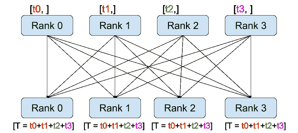 与点对点通信相反,集合允许在组中的所有进程之间进行通信模式。组是所有进程的子集。要创建一个组,我们可以将一组秩传递给dist.new_group(group)。默认情况下,集合在所有进程上执行,也称为世界。例如,为了获得所有进程上所有张量的总和,我们可以使用dist.all_reduce(tensor, op, group)集合。