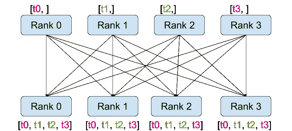 dist.broadcast(tensor, src, group): 将tensor从src复制到所有其他进程。dist.reduce(tensor, dst, op, group): 将op应用于每个tensor,并将结果存储在dst中。dist.all_reduce(tensor, op, group): 与 reduce 相同,但结果存储在所有进程中。dist.scatter(tensor, scatter_list, src, group): 将第 i ii 个张量scatter_list[i]复制到第 i ii 个进程。dist.gather(tensor, gather_list, dst, group): 将tensor从所有进程复制到dst。dist.all_gather(tensor_list, tensor, group): 将tensor从所有进程复制到tensor_list,在所有进程上。dist.barrier(group): 阻塞组中的所有进程,直到每个进程都进入此函数。