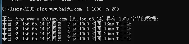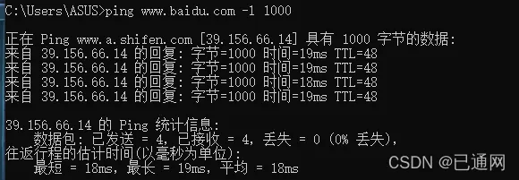 示例:Ping www.baidu.com –l 1000//ping 有多少字节的数据的连通性