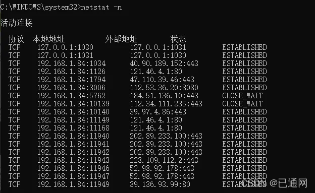 显示有源TCP连接,计算机在哪一个端口被听,以太网统计,IP路由表,IPV4统计(关于IP,ICMP,TCP,和UDP协议)和IPV6统计(关于IP,ICMP,TCP,和UDP协议)。使用无参数,网络显示激活TCP连接。