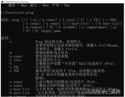 问性和名称解析问题。使用时不带参数,ping显示帮助。