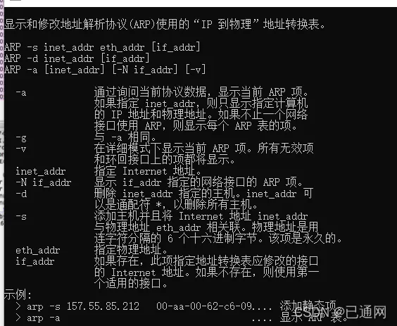 显示和修改地址解析协议(ARP)缓存中的条目,其中包含一个或多个用于存储IP地址及其解析以太网或令牌环物理地址的表。计算机上安装的每个以太网或令牌环网络适配器都有一个单独的表。在没有参数的情况下使用,arp显示帮助。