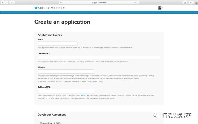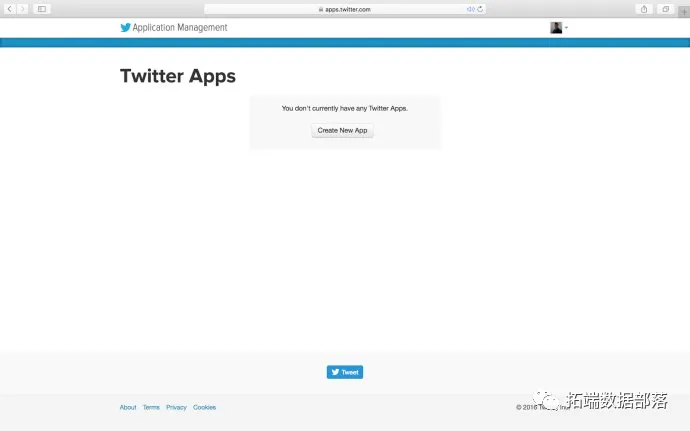 为了能够访问Twitter数据编程,我们需要创建一个与Twitter的API交互的应用程序。