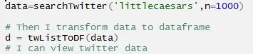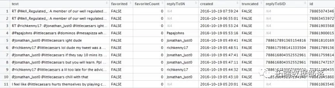根据不同的搜索词,我们可以在几分钟之内收集到成千上万的tweet。这里我们测试一个关键词 littlecaesars的twitter结果:
