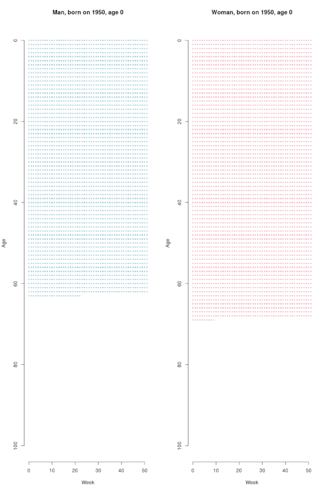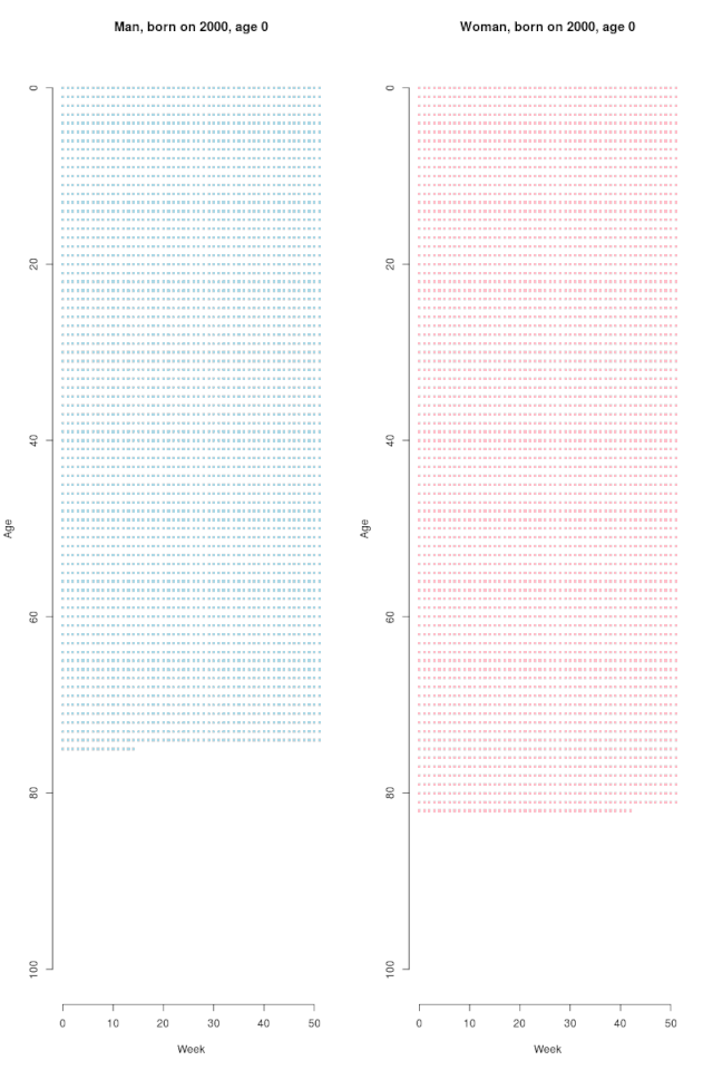 plot(va%%52,va%/%52,cex=.6,pch=15,col=c("light yellow","pink","white")[1+ (va>=age*52)*1+(va>(age+F[age+1])*52)*1],ylim=c(100,0),axes=FALSE,xlab="Week", ylab="Age",main=paste("Woman, born on ",yearborn, ", age ",age,sep=""))