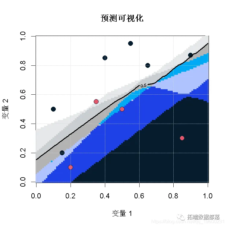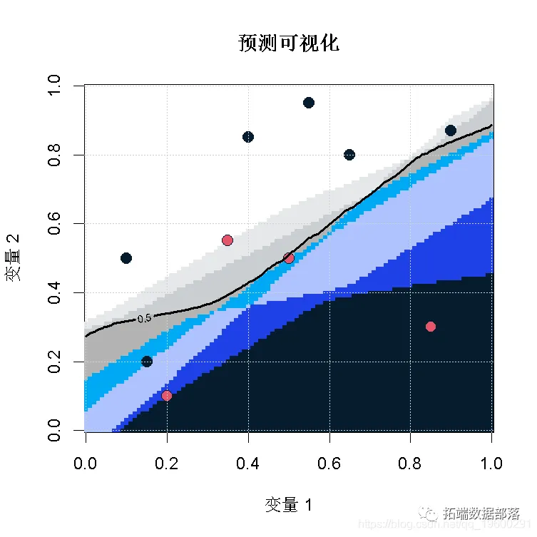 vv = outer(vu,vu,(function(x,y) mean(pre(c(x,y))) contour(vu,vu,vv,levels = .5,add=TRUE)