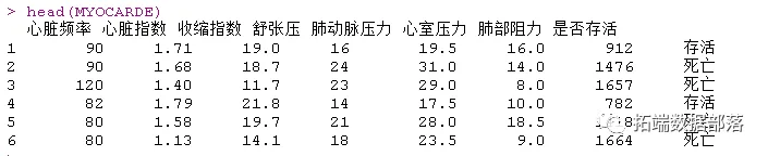 其中我们有急诊室的观察结果,对于心肌梗塞,我们想了解谁存活下来了,得到一个预测模型