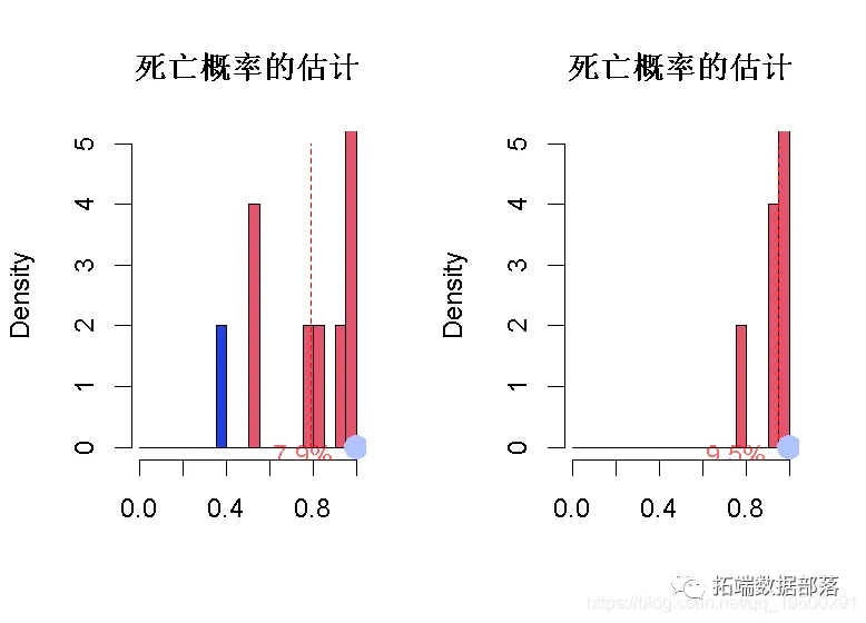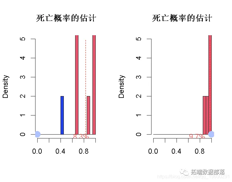 对于第一个观察,通过我们的1000个模拟数据集,以及我们的1000个模型,我们得到了以下死亡概率的估计。