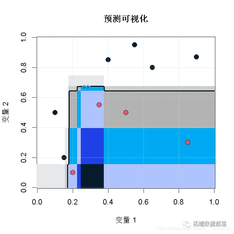 for(s in 1:1000){ idx = sample(1:n, size=n, replace=TRUE) L_tree\[s\] = rpart(y~x1+x2, } unlist(lapply(1:1000,function(z) predict(L_tree\[\[z\]\]) outer(vu,vu,Vectorize(function(x,y) mean(p(c(x,y)))