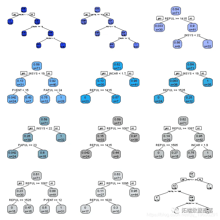 for(i in 1:12) set.seed(sed\[i\]) idx = sample(1:n, size=n, replace=TRUE) cart = rpart(PR~., md\[idx,\])