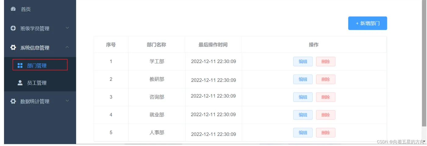 { "code": 1, "msg": "success", "data": [ { "id": 1, "name": "学工部", "createTime": "2022-09-01T23:06:29", "updateTime": "2022-09-01T23:06:29" }, { "id": 2, "name": "教研部", "createTime": "2022-09-01T23:06:29", "updateTime": "2022-09-01T23:06:29" } ] }