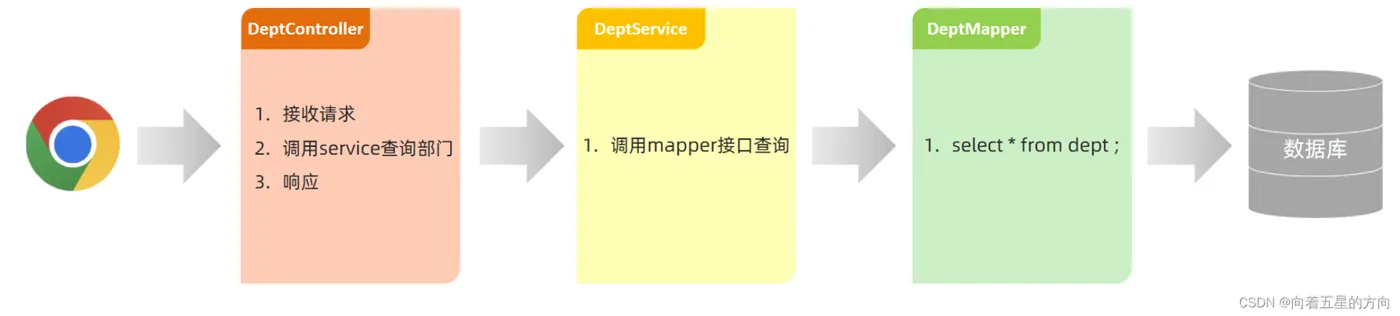 @Slf4j @RestController public class DeptController { @Autowired private DeptService deptService; //@RequestMapping(value = "/depts" , method = RequestMethod.GET) @GetMapping("/depts") public Result list(){ log.info("查询所有部门数据"); List<Dept> deptList = deptService.list(); return Result.success(deptList); } }