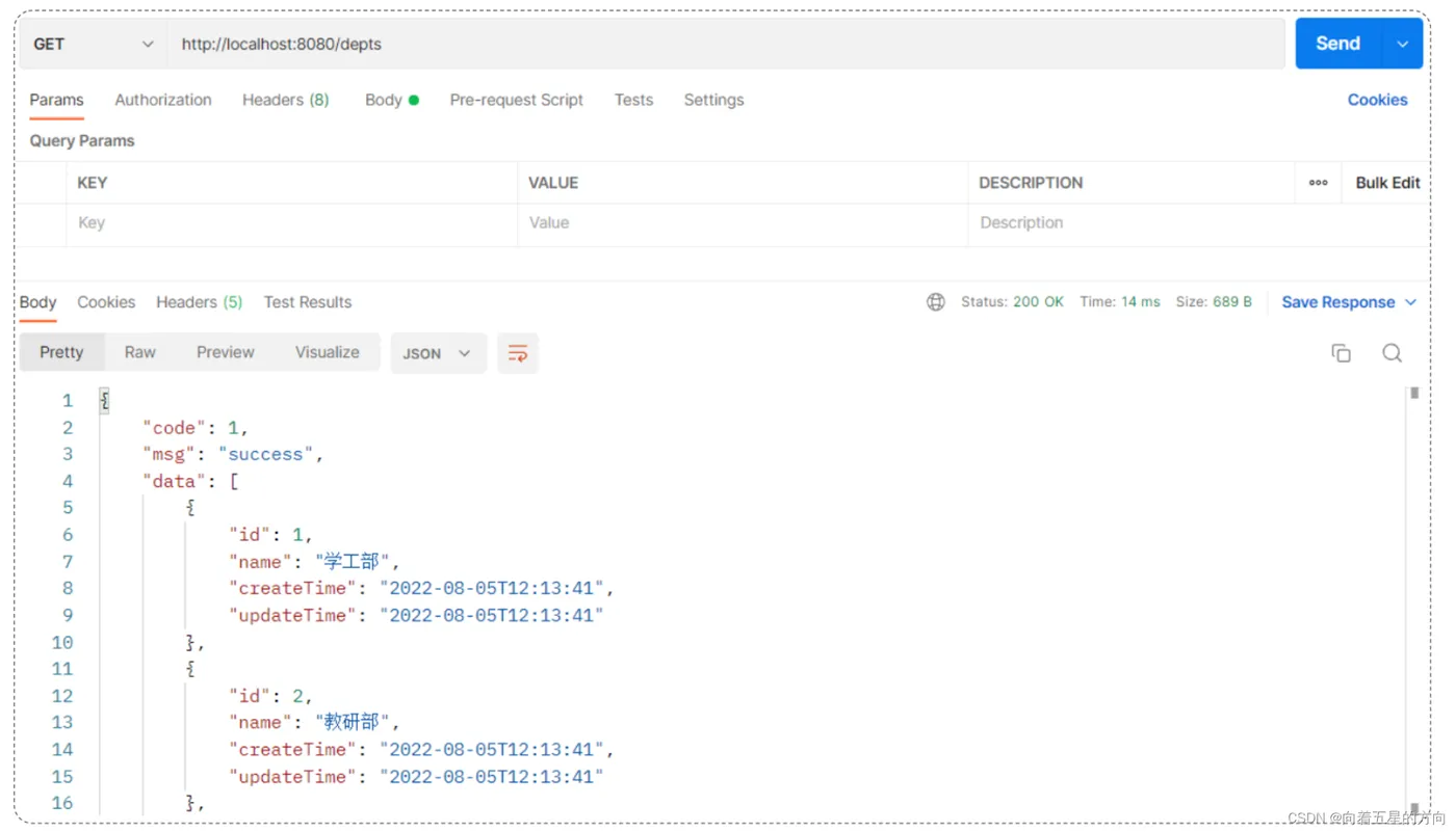 功能开发完成后,我们就可以启动项目,然后打开postman,发起GET请求,访问 :http://localhost:8080/depts